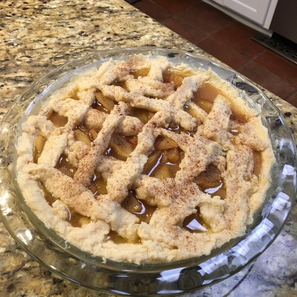 Take the smaller remaining dough ball and cut (or hand roll) into strips to weave over the top of the pie filling. Press ends of the strips into the dough on the pie pan — this is your crust, make it as thin or thick as you like. Optionally, if you can roll out your dough, feel free to roll out the top crust and cover if you so desire. Remember to vent the top.